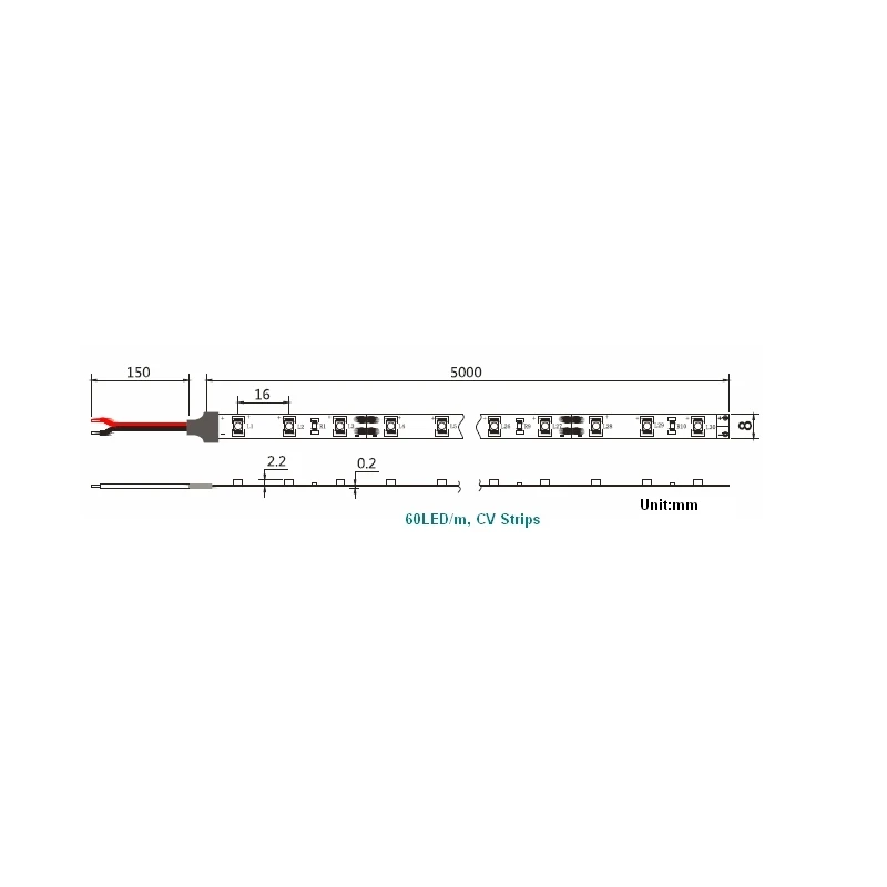 5 meter strip has about 15 cm cable. Custom length can also be ordered.