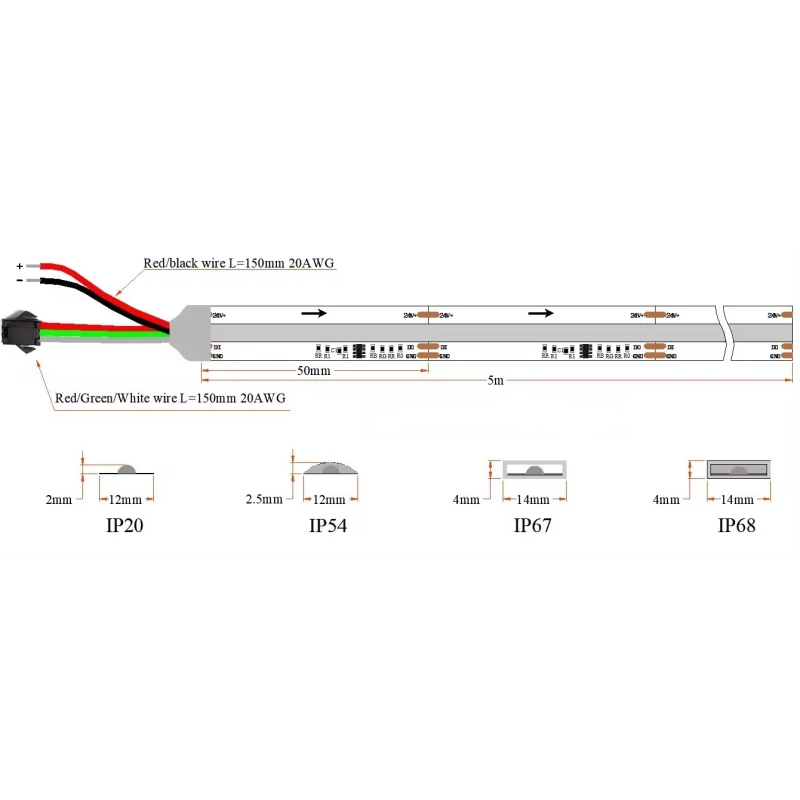 5 meetrisel ribal on küljes umbes 15 cm pikkune ühenduskaabel aga võimalik on ka tellida erineva kaablipikkusega LED ribasid.